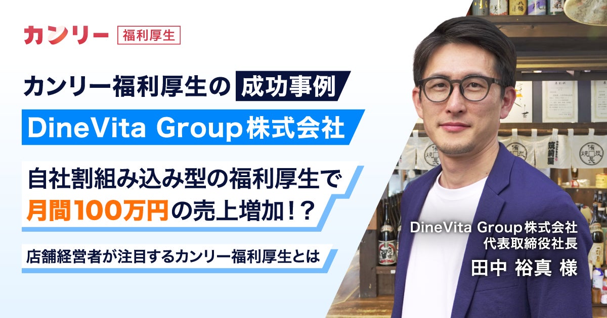 店舗経営を支える世界的なインフラの創造を目指す株式会社カンリー(所在地:東京都品川区、代表取締役:辰巳 衛、秋山 祐太朗、以下「カンリー」)は、雇用形態や働く場所を選ばずに使える「カンリー福利厚生」をご利用いただいている、DineVita Group株式会社(本社:東京都中央区、代表取締役社長:田中 裕真)へのインタビュー記事(導入事例)を公開しました。