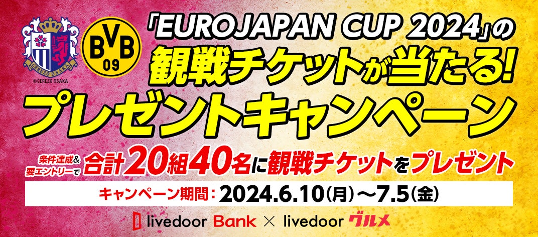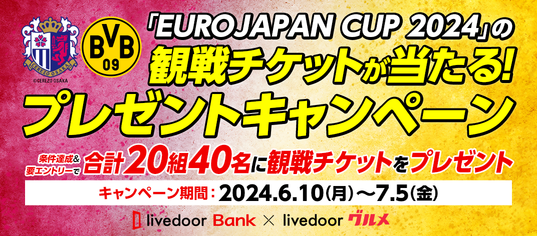 「EUROJAPAN CUP 2024」の観戦チケットが当たるプレゼントキャンペーンでは、期間中に対象サイトからエントリーのうえ、ライブドアバンクのデビットカードで合計5,000円以上のご利用により、2024年7月24日開催のEUROJAPAN CUP 2024(セレッソ大阪 vs ボルシア・ドルトムント)の観戦チケットを抽選で10組20名にプレゼントいたします。