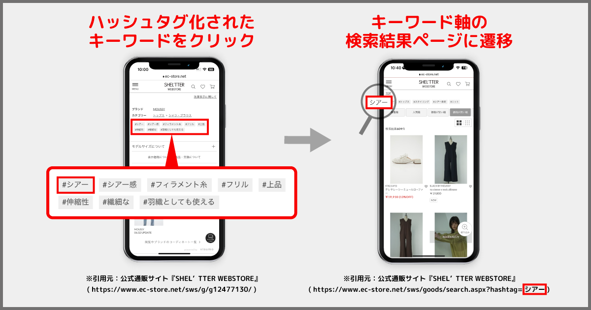この度『SHEL'TTER WEBSTORE』にてハッシュタグ活用エンジン「ZETA HASHTAG」が導入され、自動生成されたハッシュタグが商品詳細ページや各ブランドページに表示されるようになりました。