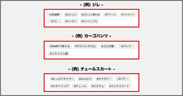 ハッシュタグおよびランディングページは商品の特徴・機能性・利用シーンなどのキーワードを軸に生成されるため、グルーピングされた関連性の高い商品の集合知を見出すことができ、ユーザーと商品の新たな接触機会の創出を後押しいたします。