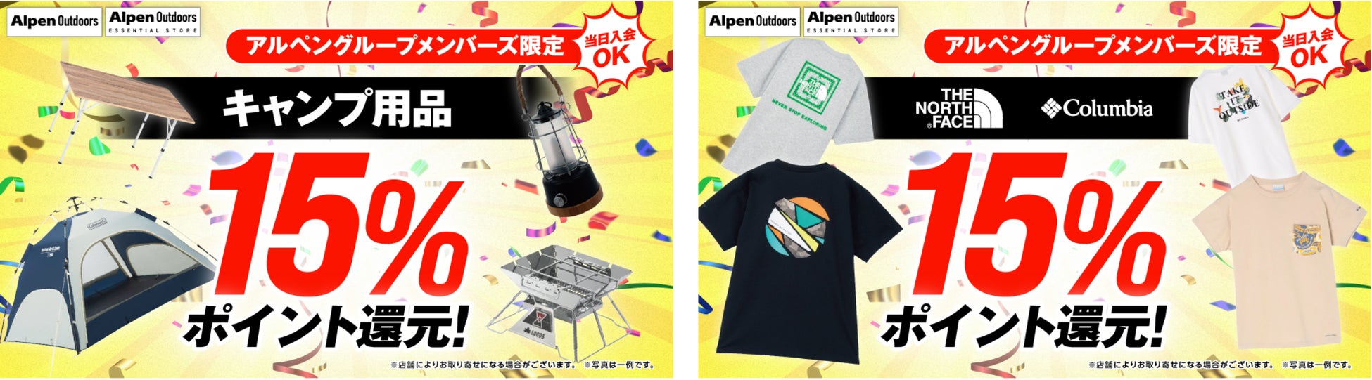 ・キャンプ用品がアルペングループメンバーズ限定(即日入会OK)で15%ポイント還元。