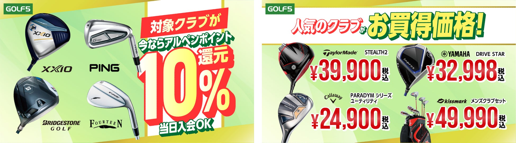 ・アルペングループメンバーズ限定(即日入会OK)で対象の新品ゴルフクラブ、ゴルフシューズ、ゴルフボールは10%ポイント還元。