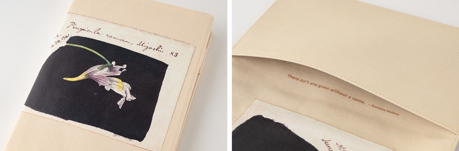 牧野博士が1901年に描いた「コウシンソウ」の植物図をプリントしたシンプルなデザインの手帳カバーが、新たにカズンサイズでも登場。2023年春に発売したオリジナルサイズも再登場します。可憐に咲くコウシンソウを生成色のコットン地にインクジェットでプリントしました。背面のポケットを広げてみると、「我が国には、名なし草などという植物は一本もない」という牧野博士の言葉を英訳した隠しメッセージも。
