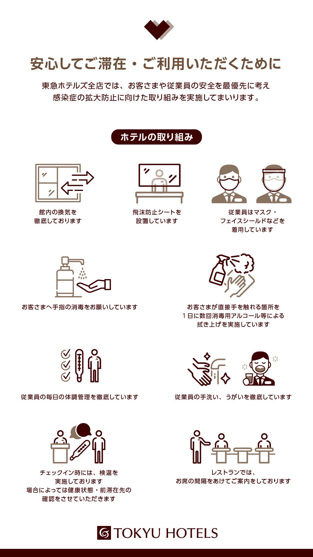 東急ホテルズは、お客さまや従業員の安全を最優先に考え、新型コロナウイルス(COVID-19)感染拡大防止に向けた取り組みを実施しております。