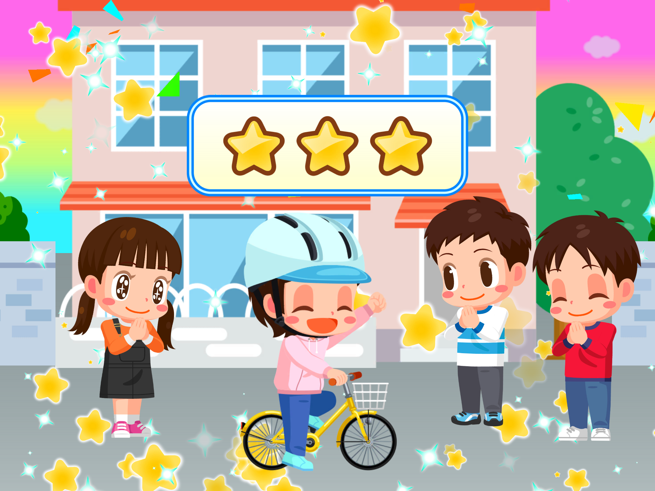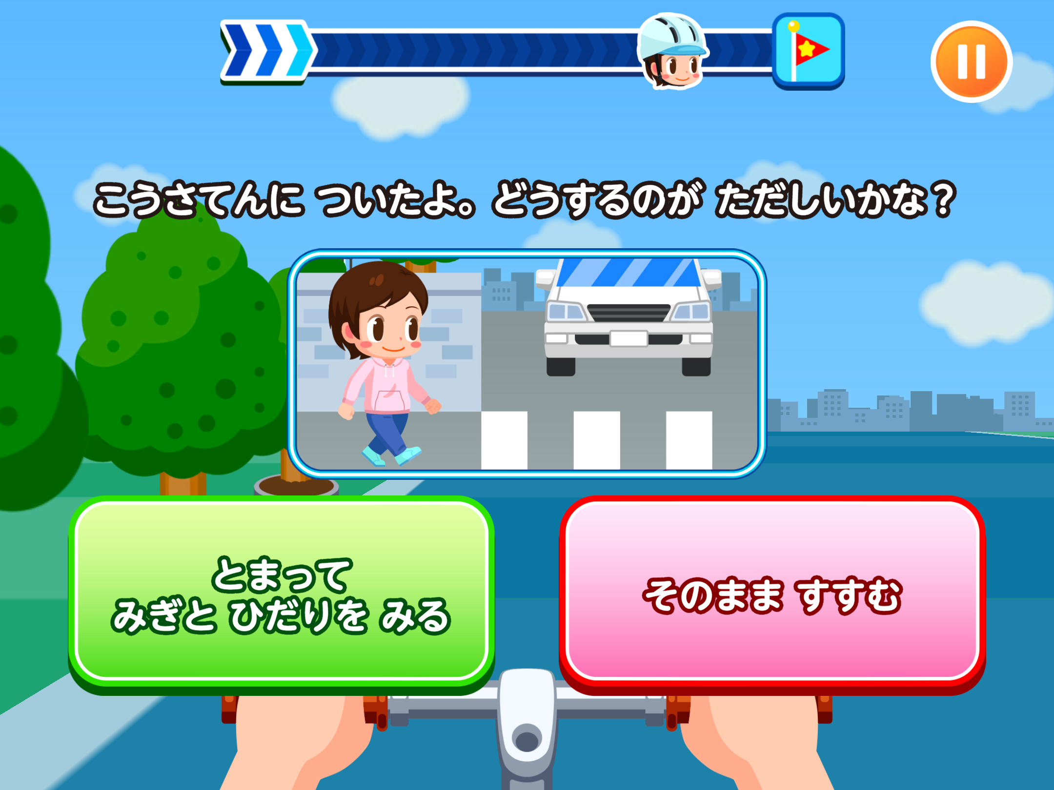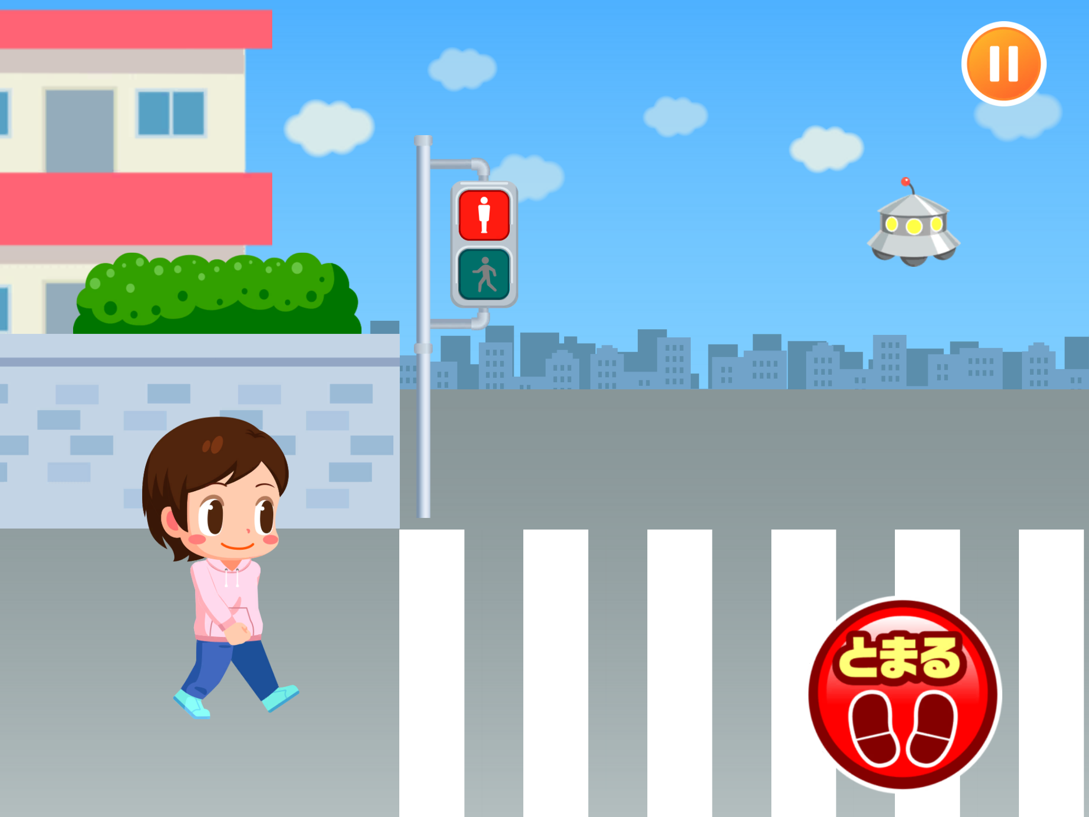 友達の家に行く道中で事故に合わないよう、危険な場所を注意しながら進んでいく交通シミュレーションゲームです。歩く、走る、自転車の3つのモードで遊ぶことができます。危険な場所を見つけたら「とまる」ボタンをタップし、注意しながら進みます。危険な場所で止まらないと警察官のキャラクターから注意を受け、止まると褒められ、一度も注意を受けることなく友達の家にたどり着くことを目指します。