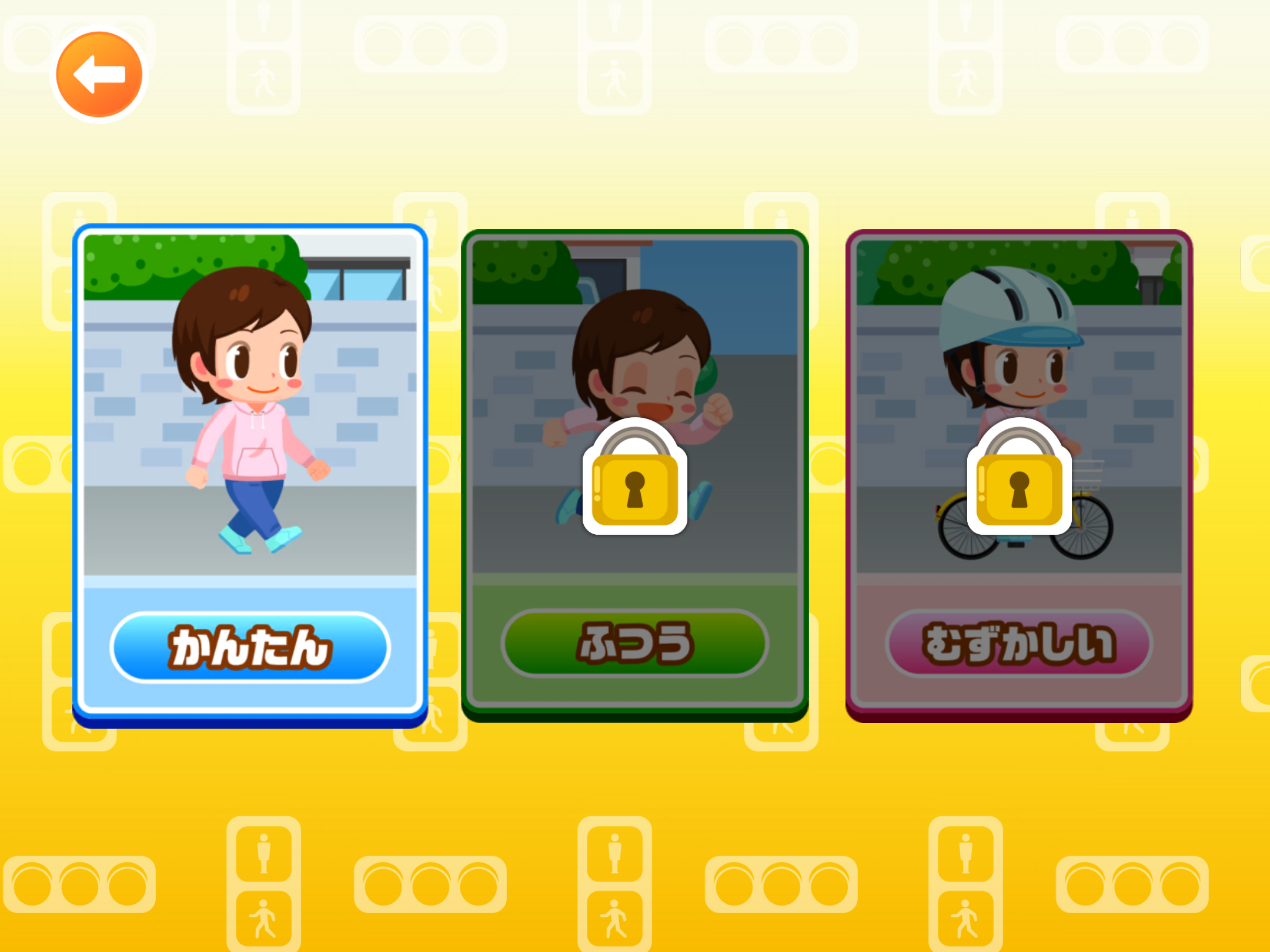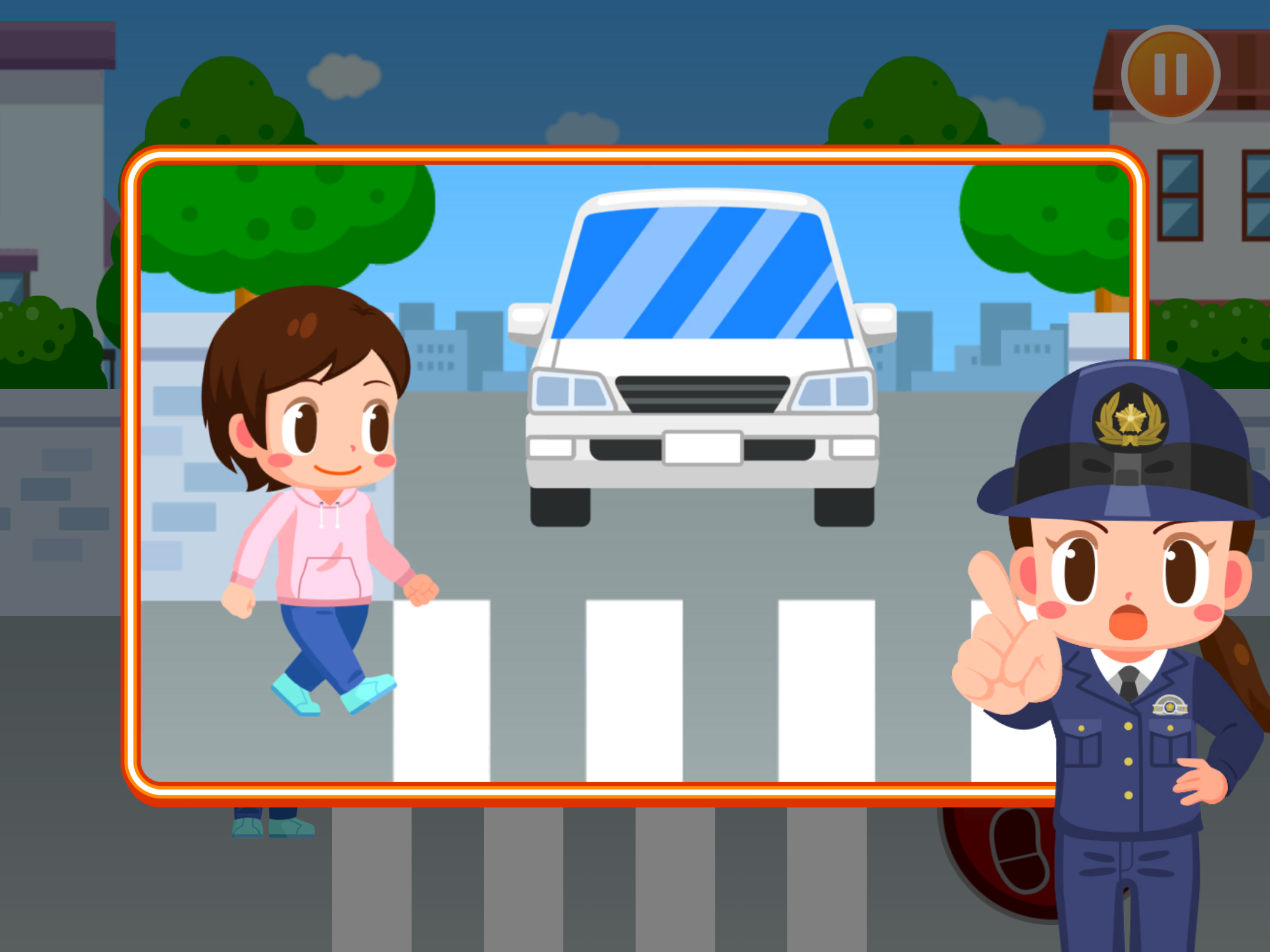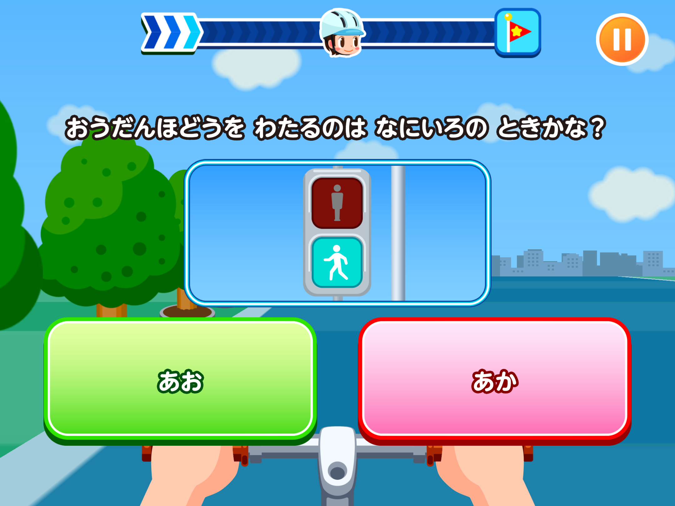 友達の家に行く道中で事故に合わないよう、危険な場所を注意しながら進んでいく交通シミュレーションゲームです。歩く、走る、自転車の3つのモードで遊ぶことができます。危険な場所を見つけたら「とまる」ボタンをタップし、注意しながら進みます。危険な場所で止まらないと警察官のキャラクターから注意を受け、止まると褒められ、一度も注意を受けることなく友達の家にたどり着くことを目指します。
