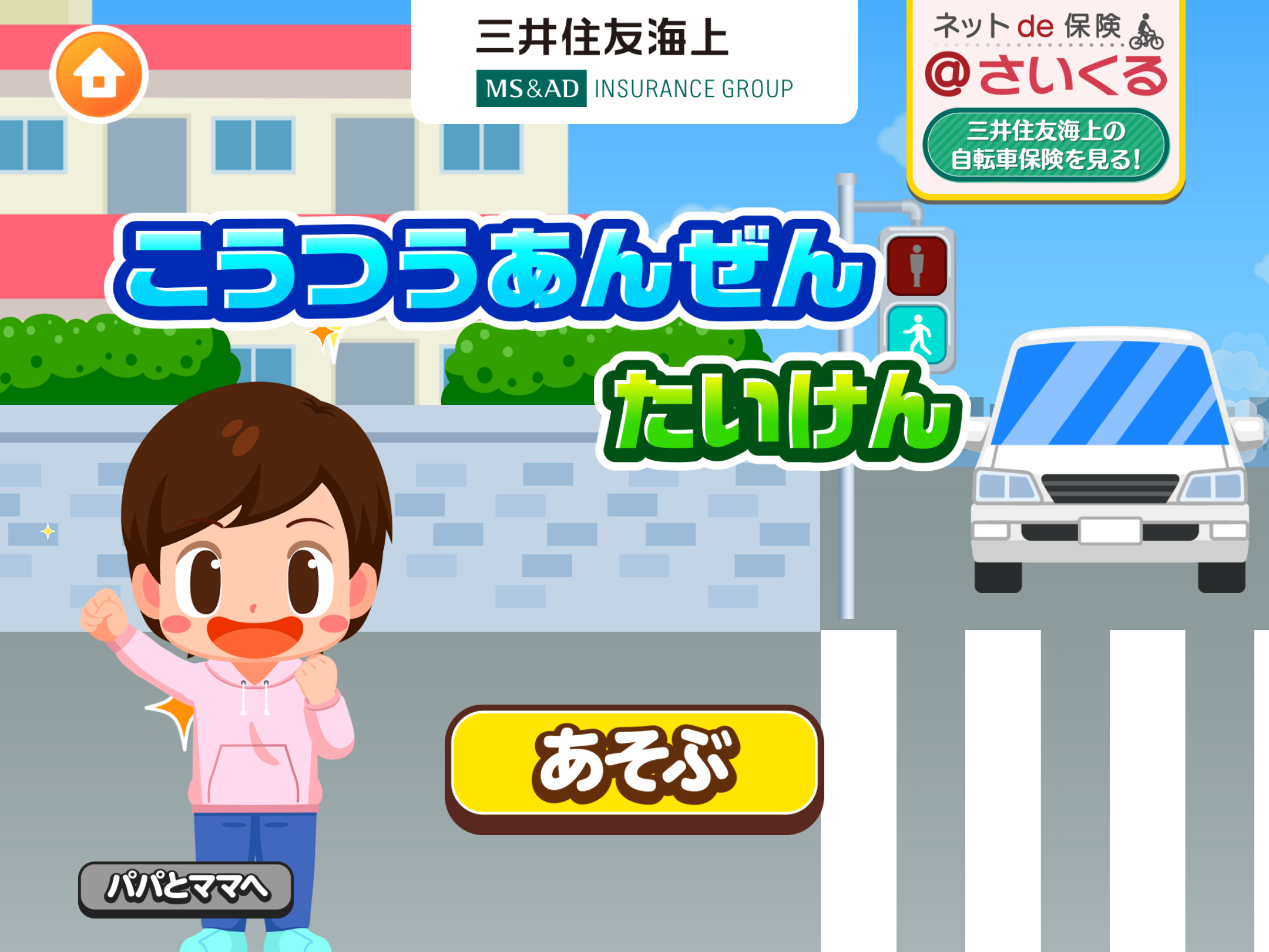 「こうつうあんぜんたいけん」は、友達の家に行く道中で、事故が起きやすい場所を学ぶことができる「ともだちのいえにいこう」と、交通ルールを学ぶことができる「こうつうあんぜんクイズ」の2つのゲームで構成されています。