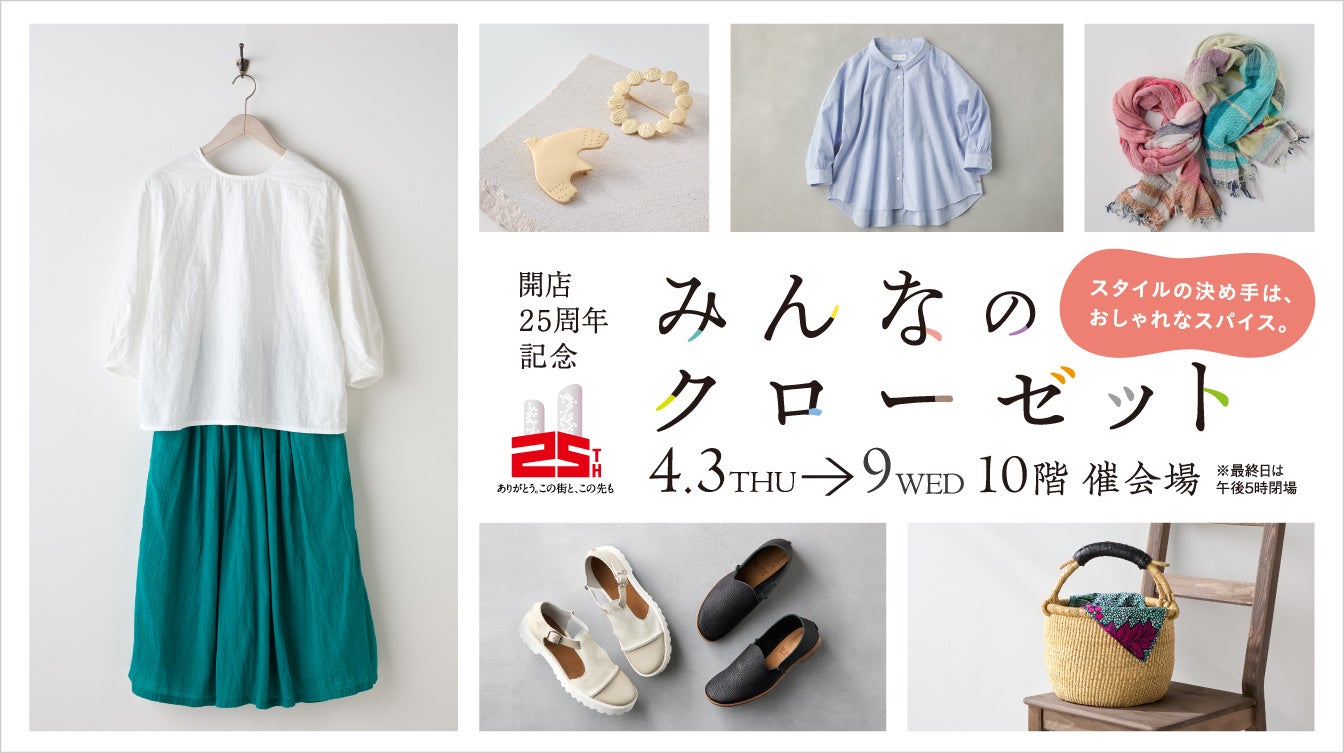 開店25周年記念「みんなのクローゼット」では、性別・年齢・季節など枠にとらわれることなく、自分らしく楽しむファッションアイテムをご提案いたします。