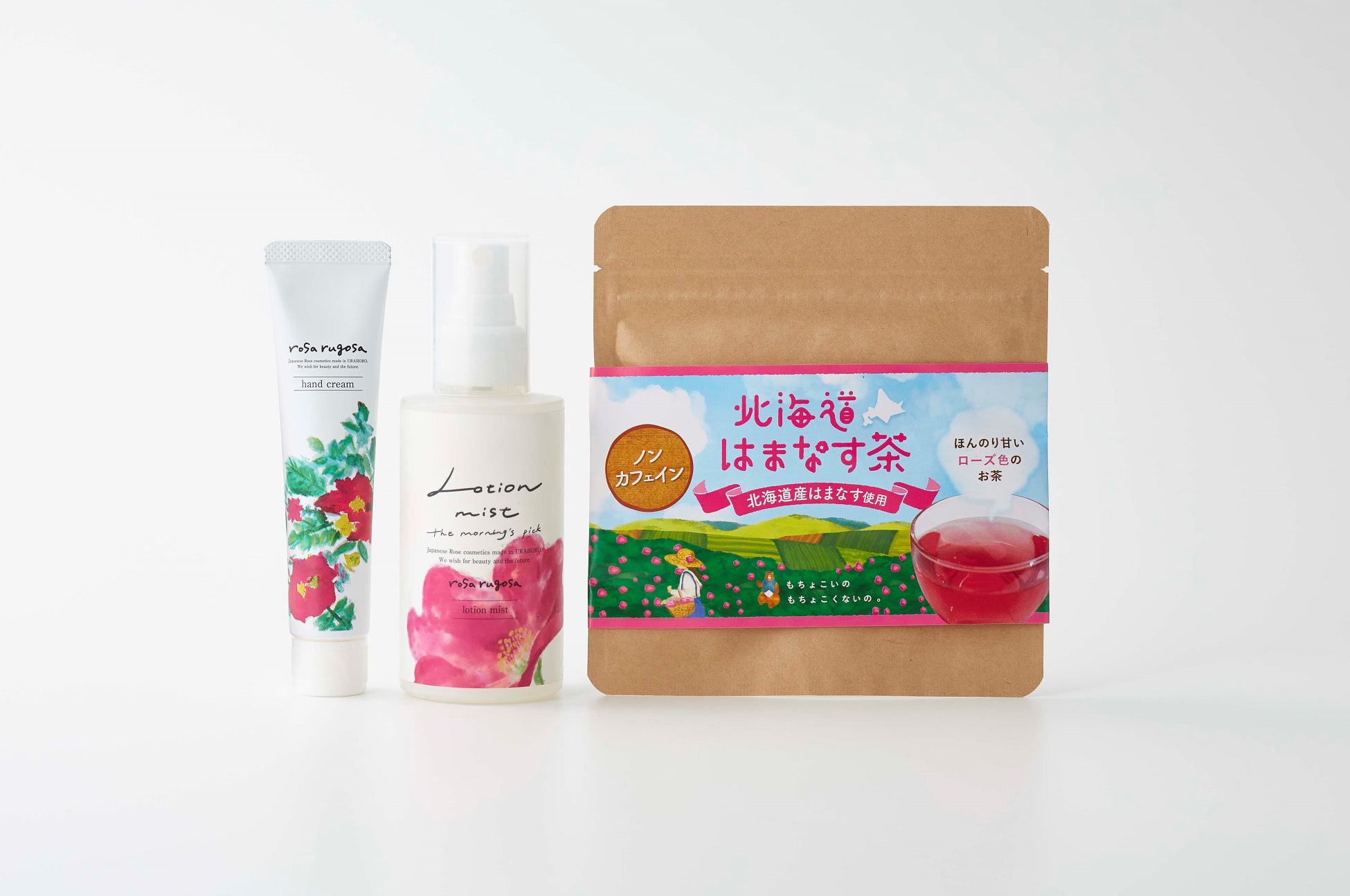 地域に暮らす子どもを軸にまちづくりを行っている北海道 浦幌町で、「町の花であるハマナスを活用してこの町を活性化したい」という地元中学生の提案から生まれたオーガニックコスメブランド。地域住民の手で育て摘み取られたハマナスを使用した、北海道の冬の乾燥にも負けないハンドクリームやローションミスト、身体を温める"はまなす茶"をセットに。