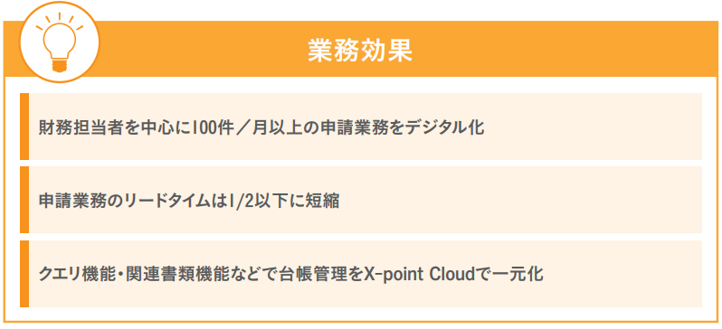これらの課題を解消し、申請業務から後工程までを含めた業務の効率化を実現するため、クラウド型ワークフロー「X-point Cloud」を導入しました。