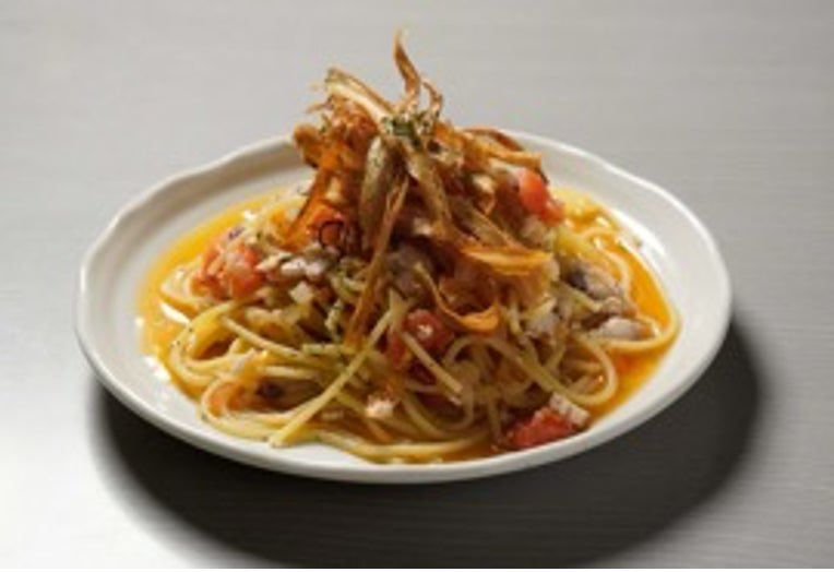 【日替わり麺】サバと香味野菜の青森県産ニンニクパスタ 青森県産ゴボウチップ添え