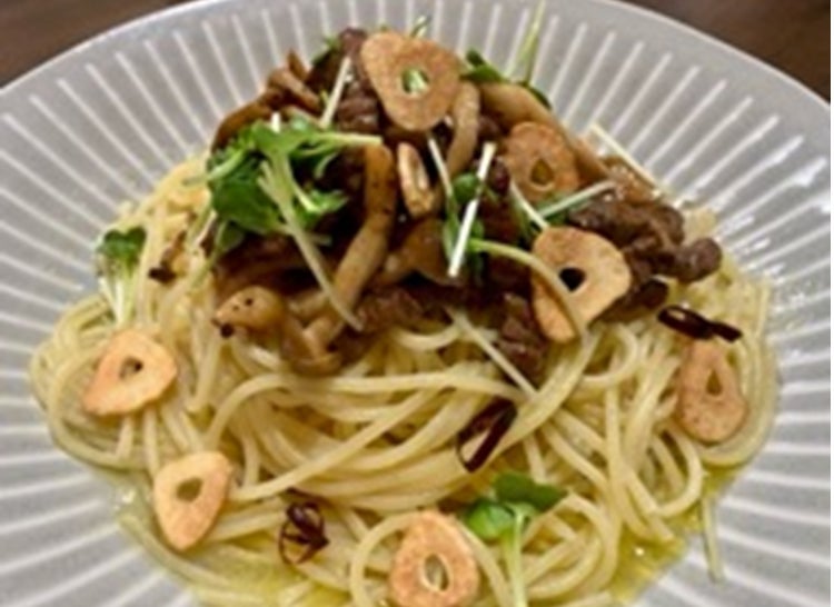 【日替わり麺】青森県産ニンニクの牛肉とキノコのペペロンチーノ