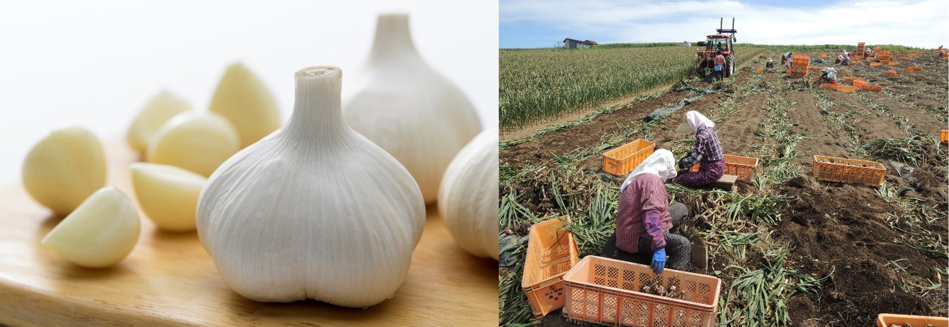 青森県のニンニクは冬の厳しい寒さで、ゆっくり糖度を蓄えた味わいが特徴で、青森県は日本の中でも有数の産地のひとつです。国内生産量の約70%という高いシェアを占める青森県のニンニクは、大玉で1片が大きく、実がよく締まり、雪のような白さと品質のよさが特徴です。県内では気候に適した「福地ホワイト」という系統の品種が生産されており、他品種に比べて辛さは少なく甘みがあるため市場で高い評価を得ています。青森県は種のよさのみならず、ニンニクの栽培に適した風土や土づくり、高度な栽培技術やきめ細かい管理、さらには乾燥・貯蔵技術によって、日本一品質のいいニンニクを通年で供給しています。