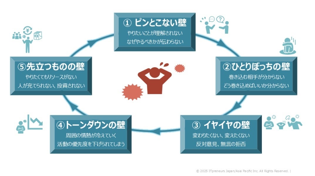 変革を阻む代表的な例を「5つの壁」として提示し、国際的に認知されている手法と関連付けながら対処法を検討します。