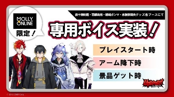 株式会社イオンファンタジー(本社:千葉県千葉市、代表取締役社長:藤原徳也、以下、当社)が運営するオンラインクレーンゲーム「MOLLY.ONLINE(モーリーオンライン)」は、カバー株式会社(本社:東京都千代田区、代表取締役社長:谷郷元昭)の男性VTuberグループ「ホロスターズ」から2022年デビューしたユニット《UPROAR!!》のメンバー「夜十神 封魔」「羽継 烏有」「緋崎 ガンマ」「水無世 燐央」4人を起用したモーリーオンライン限定プライズゲーム用景品を8月19日(金)18時より展開します。各アイテムの等身イラストは、《UPROAR!!》メンバーでもある緋崎 ガンマさんが描き下ろしを担当、デフォルメイラストは、藤咲レオさんの描き下ろしデザインです。