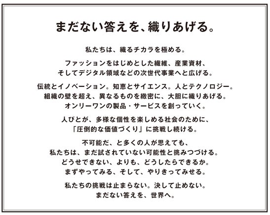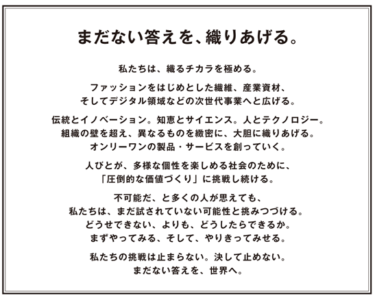ブランドスローガンに「まだない答えを、織りあげる。」を掲げ、オンリーワンの製品・サービスを創っていくビジョンを示しました。