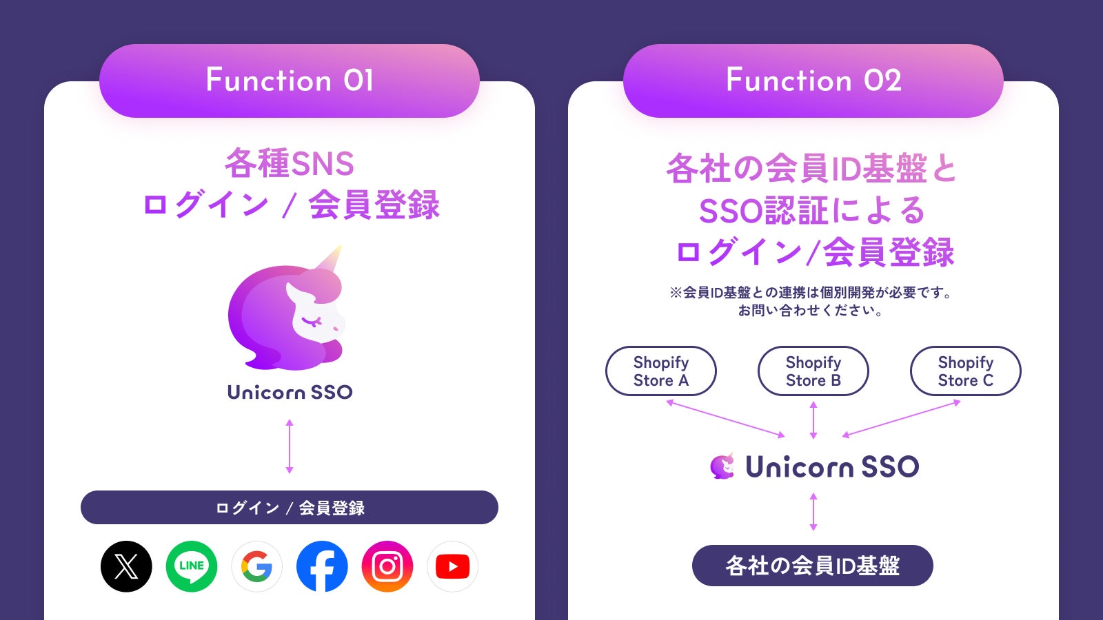 「Unicorn SSO」は、Google、X、LINE、Facebookといった主要なプラットフォームでのログインが簡単に実現できるアプリです。さらに、マーチャントごとの個別カスタマイズにより、各社の共通ID基盤とのSSO認証や、複数のブランドサイト間でのシームレスなログインも実現可能です。
