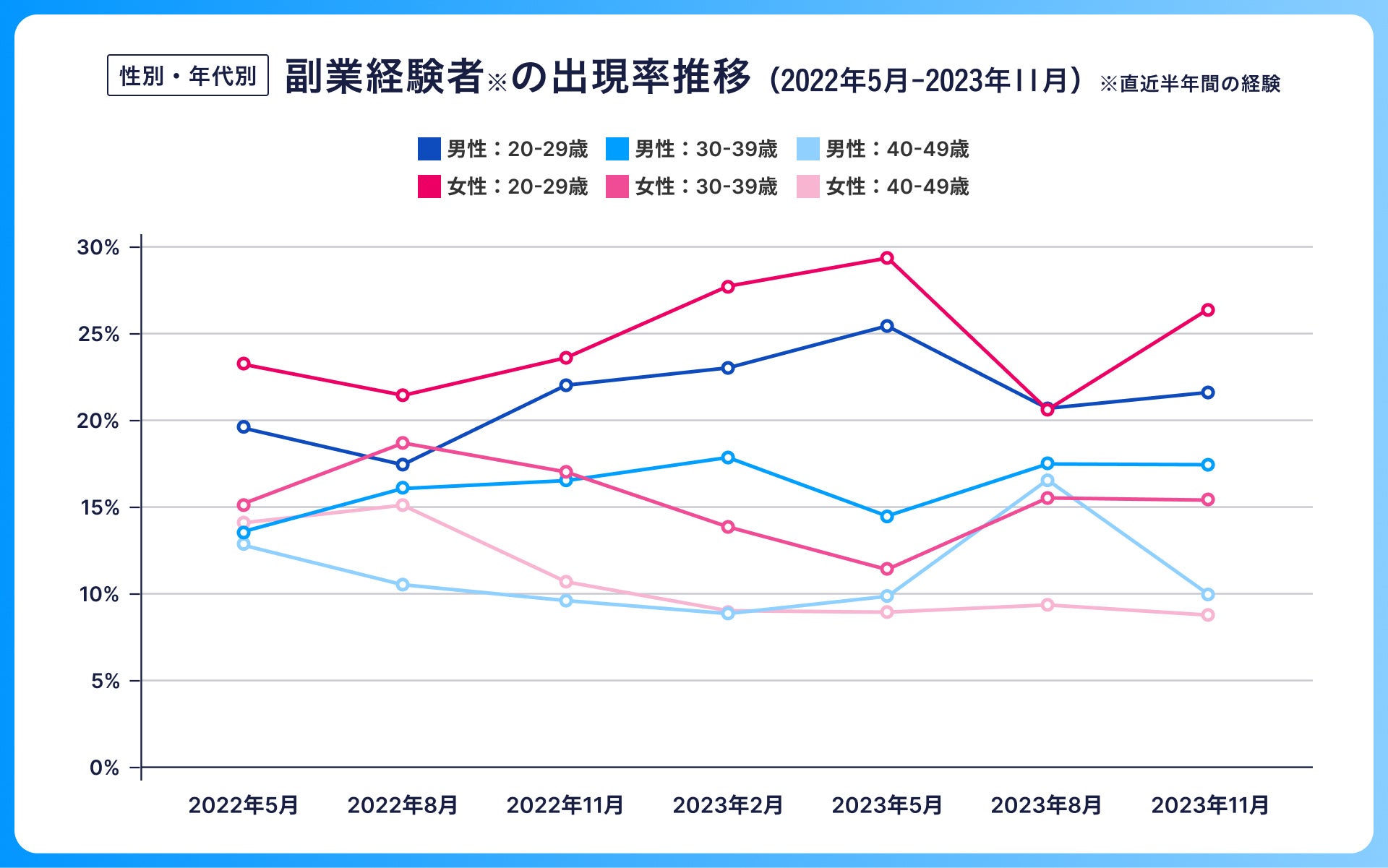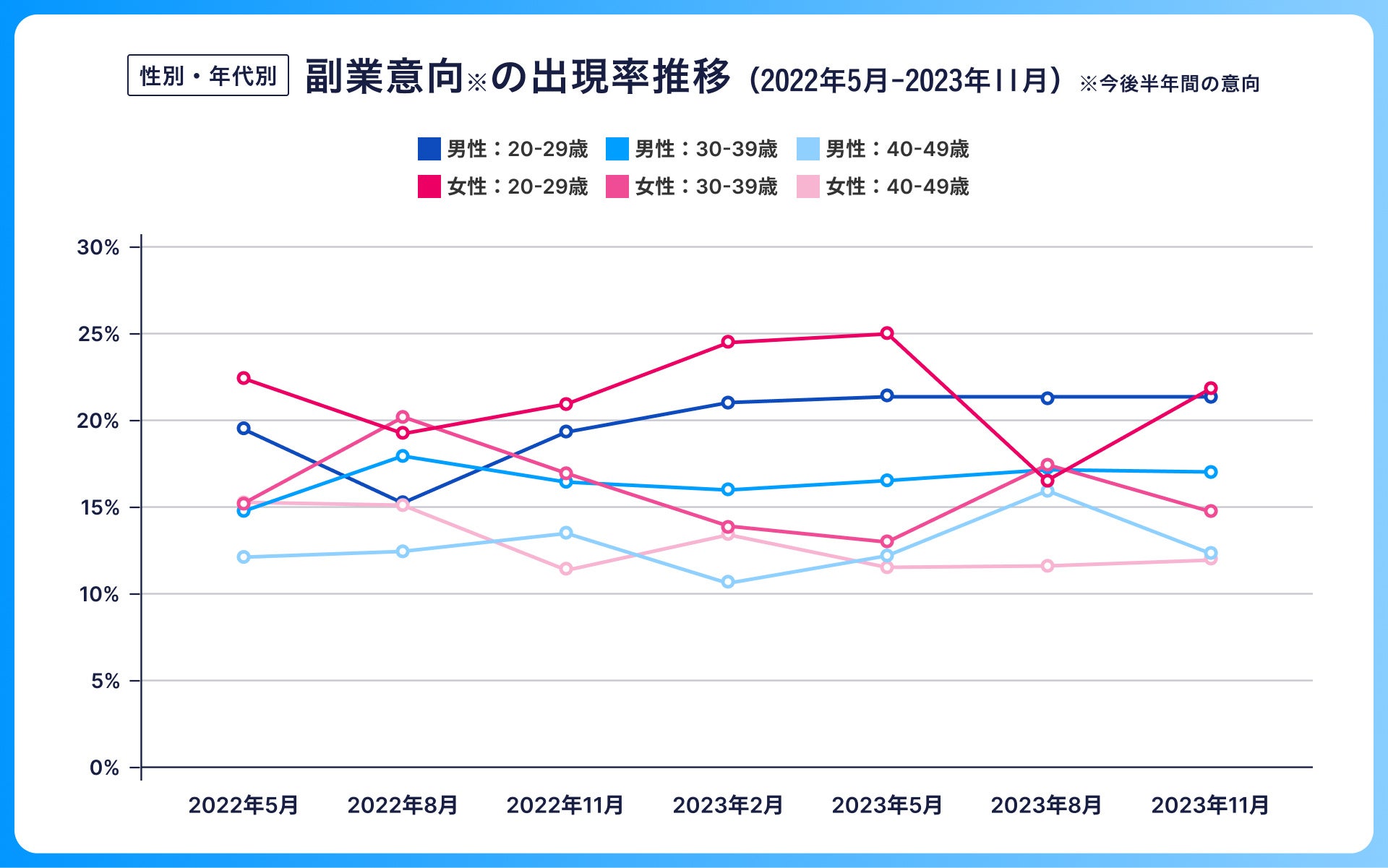 直近半年の間での副業意向は51.7%となり、調査を開始した2022年5月から2023年11月まででもっとも多い結果となりました。男女年代別でみると、前回の調査と比べて、20代女性の副業意向が16.6%から22.0%へと大幅に増加しました。一方で、男性40代は前回の調査と比べて16.0%から12.4%と大幅に減少しています。