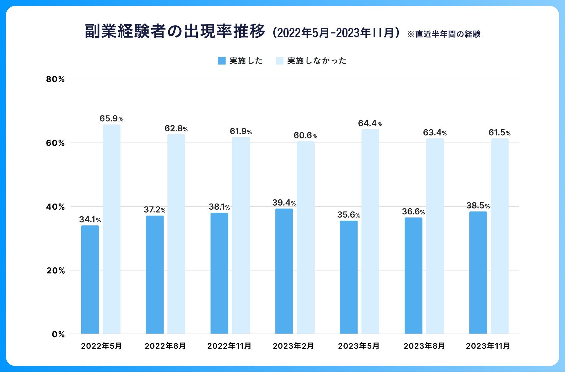 ✓直近の副業経験者は、2023年5月に落ち込んだものの再び前年同月の水準まで回復