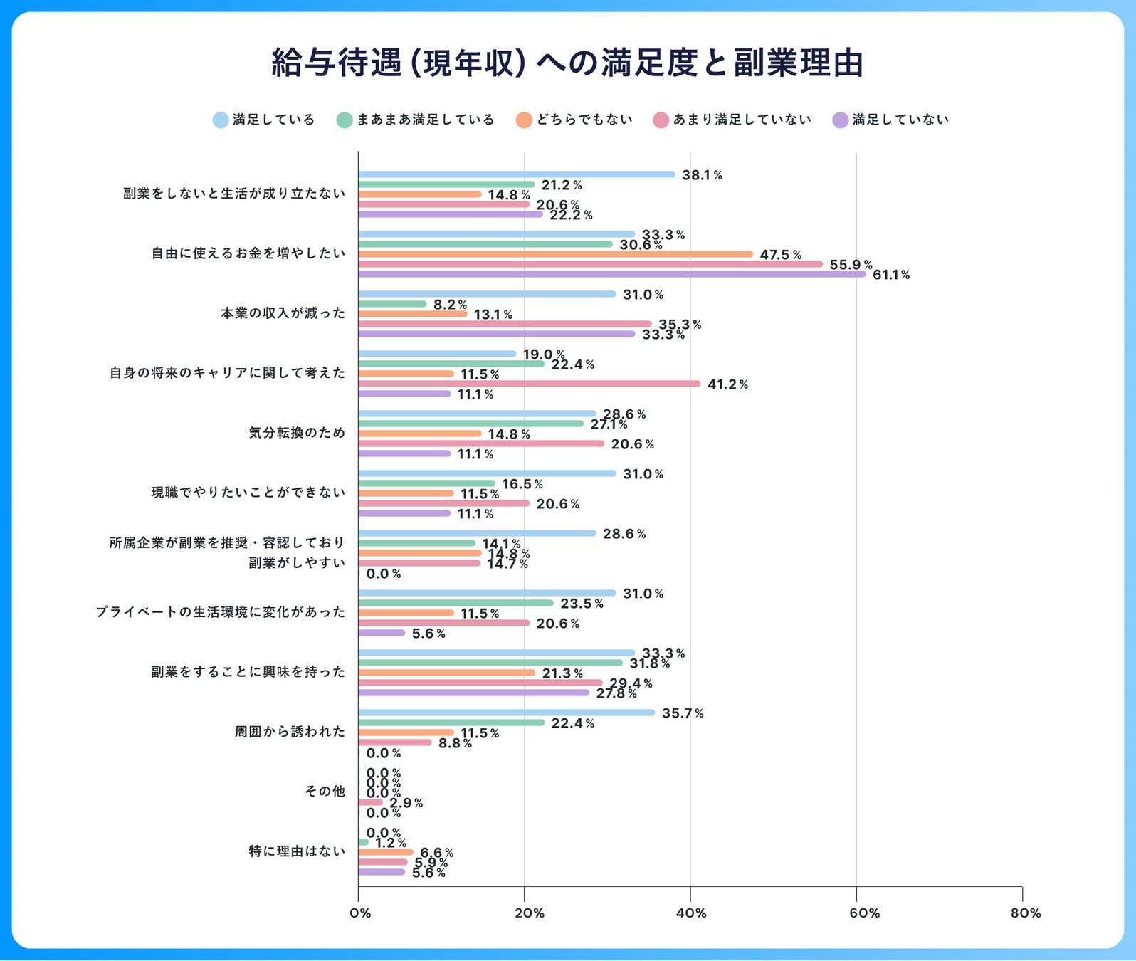 所属している企業での人事考課/給与待遇(現年収)の満足度別に副業の実施理由についてみてみると、「周囲から誘われた」の回答は、人事考課/給与待遇ともに満足度が高ければ高いほど回答率が高くなっていることが分かりました。また、「現職でやりたいことができない」の回答は人事考課/給与待遇ともに「満足している」と回答した方の割合が他の満足度の選択よりも回答率が高くなっています。