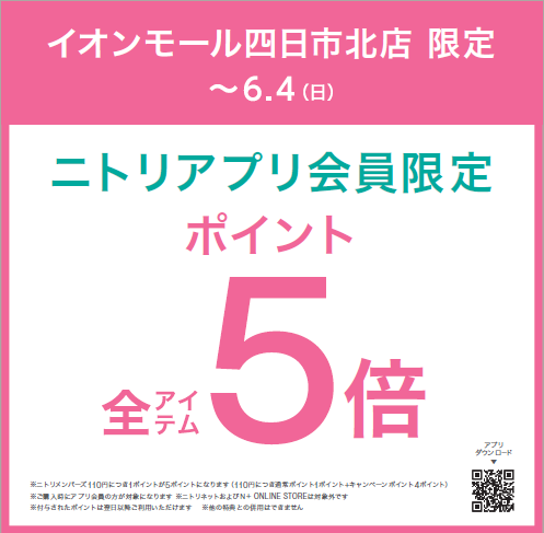 N+おすすめの14アイテムをスペシャルプライスでご⽤意する他、ニトリアプリ会員様限定特典として、全アイテムポイント5倍でお買い求めいただけます。