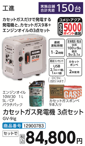・災害時の非常用電源として、ガソリンではなく、カセットガスだけで