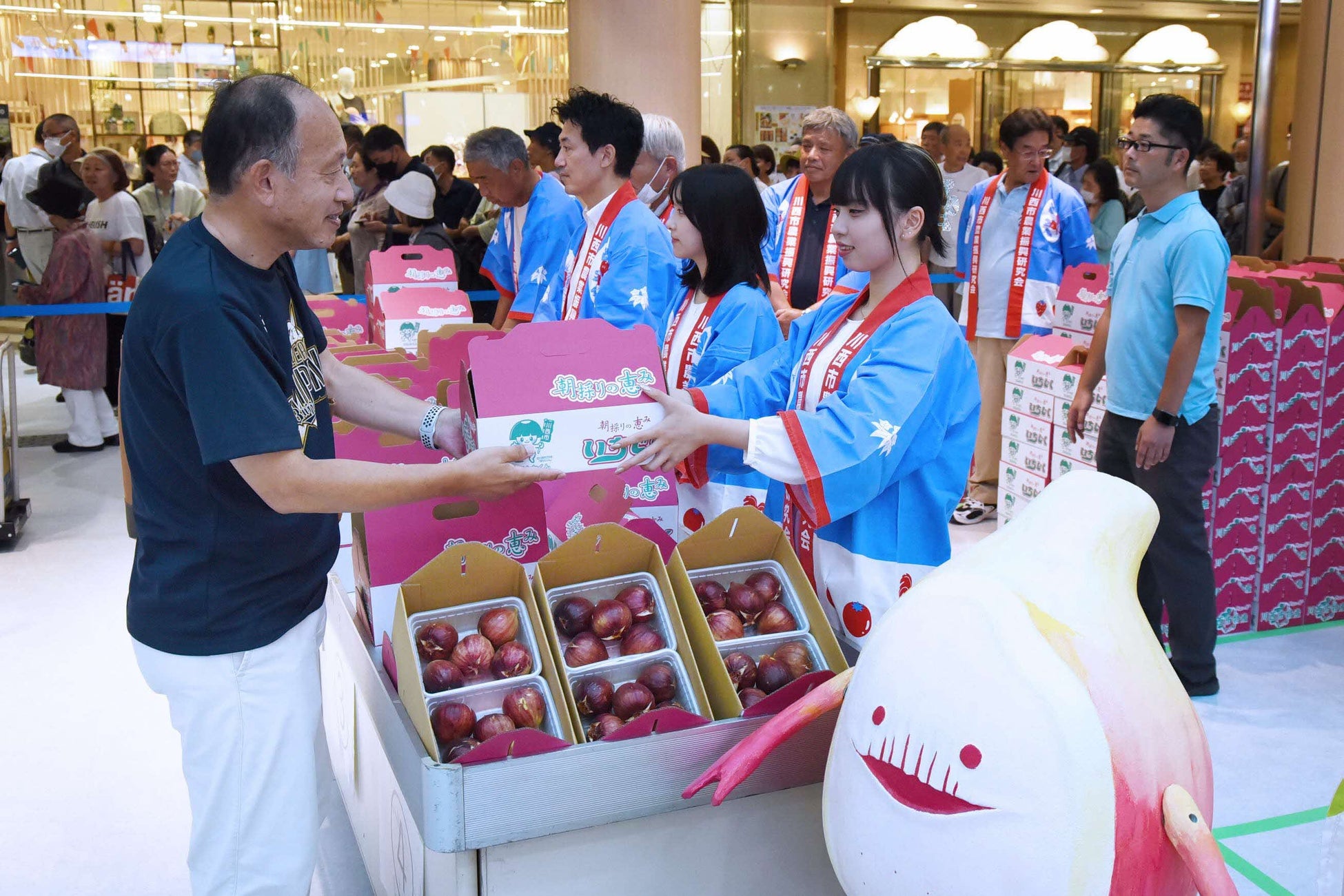 即売会は、毎年この時期に開催を予定していますが、天候や新型コロナウイルス感染症の影響により令和元年度以降中止が続いており、6年ぶりの開催となりました。これからが収穫最盛期の川西のいちじくは完熟したいちじくを朝採りするのが特長で、市南部の久代・加茂・栄根地区を中心に、約100戸余りの農家が約12ヘクタールの畑で生産。年間約400トンを出荷しています。太陽がまだ昇らない早朝から一つ一つ丁寧に収穫され、その日のうちに市場に出回ります。