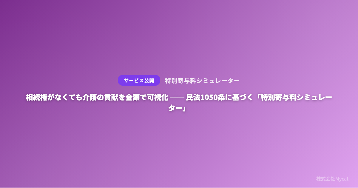 株式会社Mycatは、相続権を持たない親族が行った介護の貢献を金額として可視化する無料Webツール「特別寄与料シミュレーター」(https://tokubetu.xyz)を公開した。