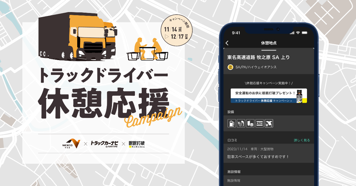 『トラックカーナビby NAVITIME』でトラックドライバーの休憩場所探しをお手伝いし、『眠眠打破』や休憩時に使えるクーポンなどで休憩取得を促進することで、日本の物流を支えるトラックドライバーの安全運転に寄与したくキャンペーン実施に至りました。
