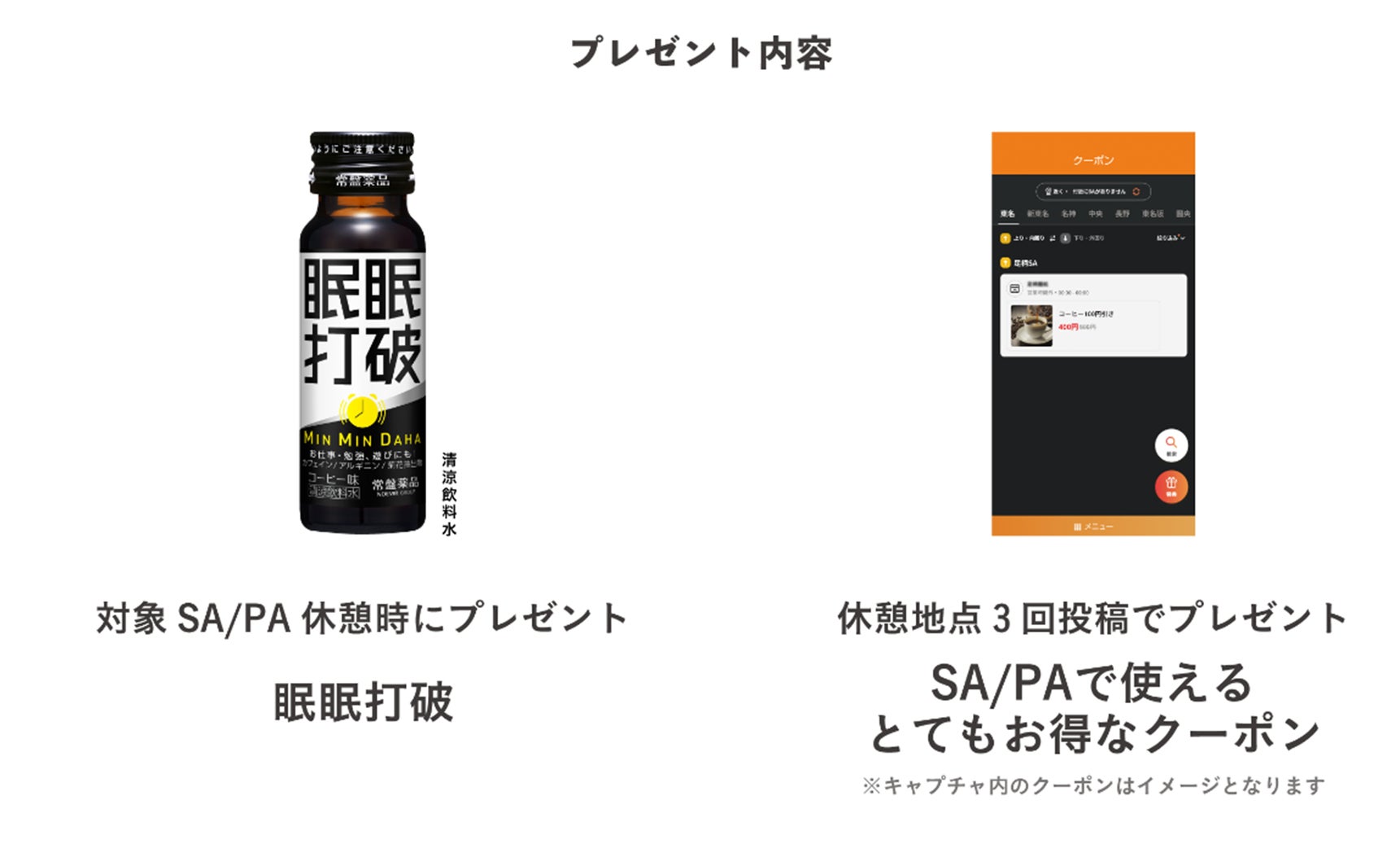 期間中に、トラック専用カーナビアプリ『トラックカーナビby NAVITIME』内の「休憩地点マップ」にて休憩地点を検索し、NEXCO中日本のキャンペーン対象サービスエリア・パーキングエリア(以下SA・PAという)を実際に訪れた方に、『眠眠打破』をプレゼントいたします。