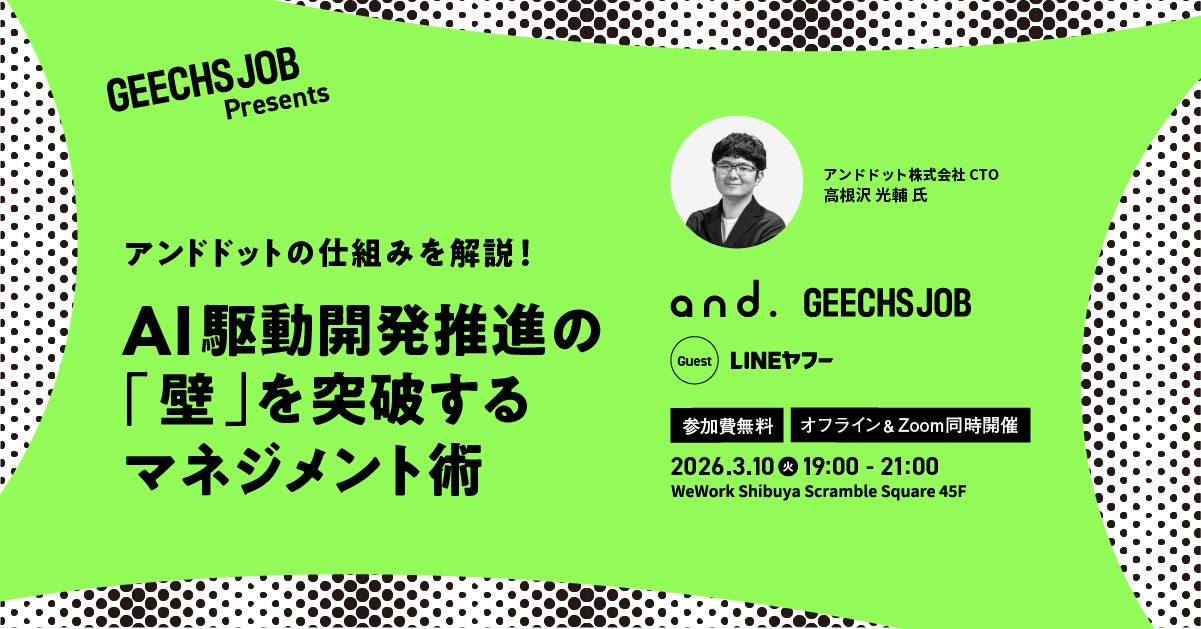 ギークス株式会社(本社:東京都渋谷区、代表取締役CEO:曽根原 稔人、以下ギークス)は、2026年3月10日(火)19:00~21:00にて、開発組織のマネージャー(CTO、PM、EM)向けの無料セミナー「アンドドットの仕組みを解説!AI駆動開発推進の『壁』を突破するマネジメント術」を開催します。
