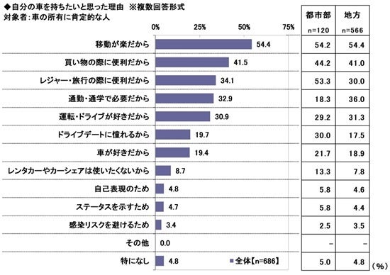都市部在住者には、レジャーや旅行、デートといった楽しみのために車を所有したいと考える方が多いようです。また、「通勤・通学で必要だから」(都市部18.3%、地方36.0%)は、都市部と比べて地方のほうが10ポイント以上高くなりました。