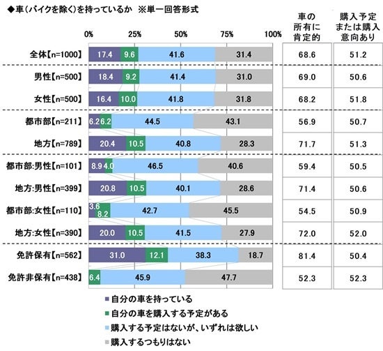 次に、車(バイクを除く)を持っているかを聞いたところ、「自分の車を持っている」は17.4%、「自分の車を購入する予定がある」は9.6%、「購入する予定はないが、いずれは欲しい」は41.6%で、合計した『車の所有に肯定的』な方の割合は68.6%となり、「購入するつもりはない」は31.4%でした。