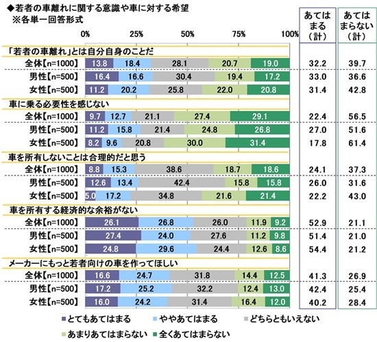 全回答者1,000名に、若者の車離れに関する意識や車に対する希望について、それぞれどの程度あてはまるかを聞きました。