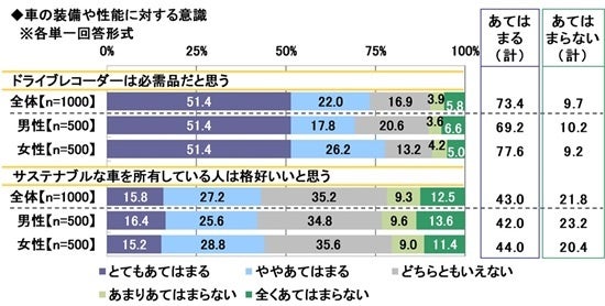 全回答者1,000名に、車の装備や性能に対する意識について、それぞれどの程度あてはまるかを聞きました。