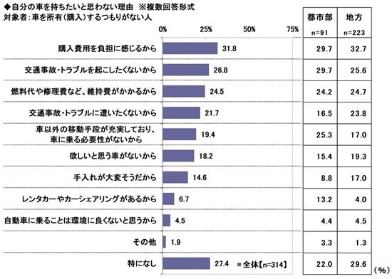 他方、「交通事故・トラブルに遭いたくないから」(都市部16.5%、地方23.8%)と「手入れが大変そうだから」(都市部8.8%、地方17.0%)は、都市部と比べて地方のほうが5ポイント以上高くなりました。