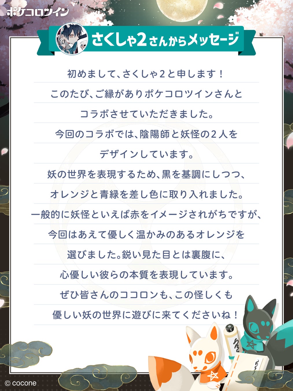 さくしゃ2さんの描き下ろしイラストを元にしたアバターファッションアイテムだけでなく、イラストの世界観をより楽しめるよう、テーマに合わせた「ココリウム」のアイテムも期間限定ガチャから入手することができます。また、さくしゃ2さん直筆サイン色紙や描き下ろしイラストを使用したオリジナルグッズが当たる記念キャンペーンなども実施。『ポケコロツイン』のお客様だけでなく、さくしゃ2さんのファンの方も楽しめる企画をご用意しています。