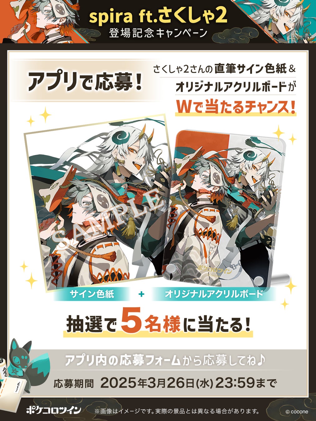 さくしゃ2さん直筆サイン色紙と描き下ろしのキービジュアルを使用したオリジナルアクリルボードを、抽選で5名様にプレゼントします。『ポケコロツイン』のアプリ内から応募できますので、この機会にぜひ遊んでみてください。