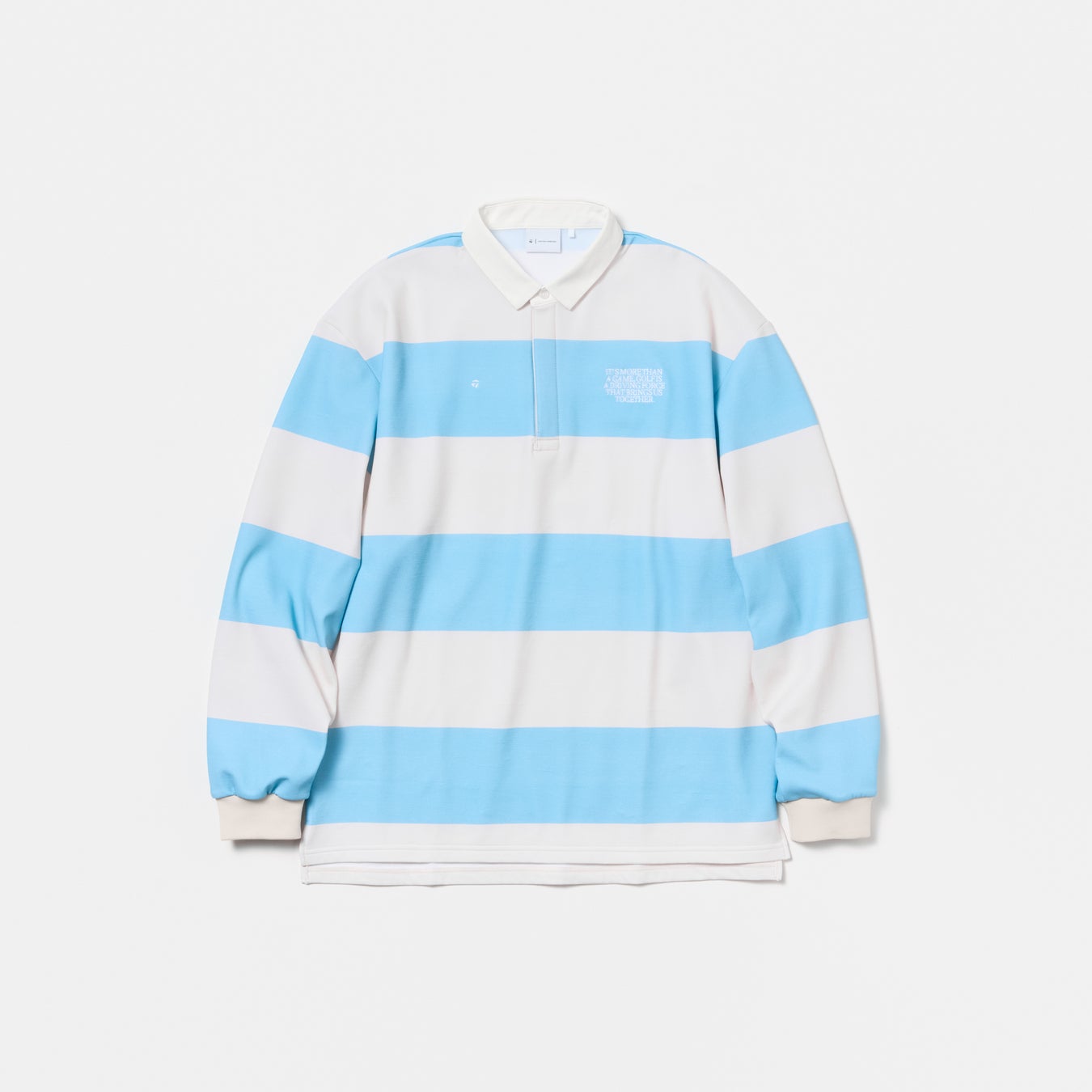 リラックスシルエットのボーダー柄ラガーシャツ。左胸にメッセージグラフィック、右胸にメタルTロゴを配しています。ユニセックスで着用いただけます。