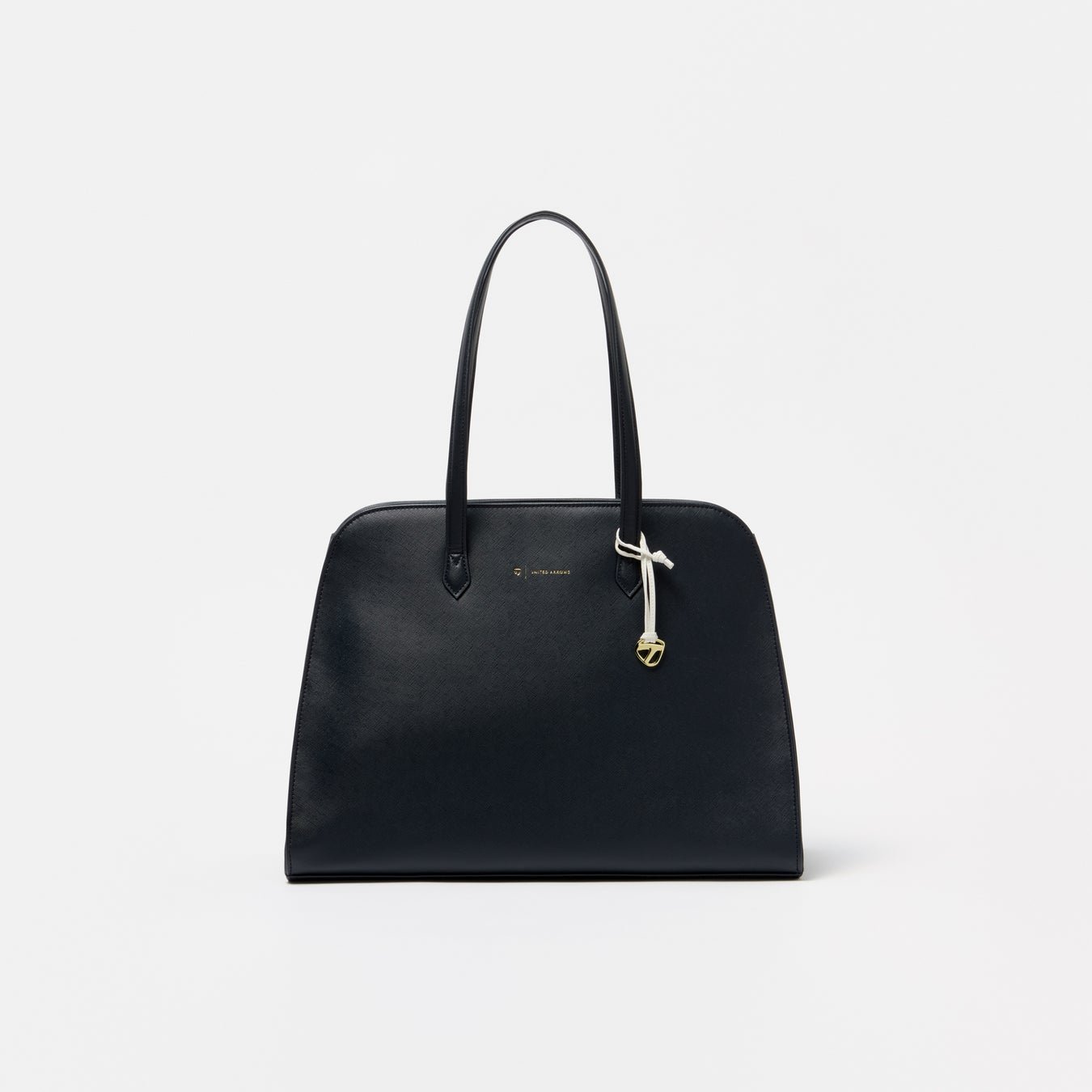 高級感のある合成皮革を採用した、上品でクラシカルな印象のトートバッグ。シックなネイビーのボディに、ゴールドで箔押しされたロゴがアクセントに。内側にプリントしたストライプ柄がさりげないポイントです。肩掛けできるハンドルに、マチを調整できるサイドのホックボタンを施した、使い勝手の良さにもこだわったアイテムです。