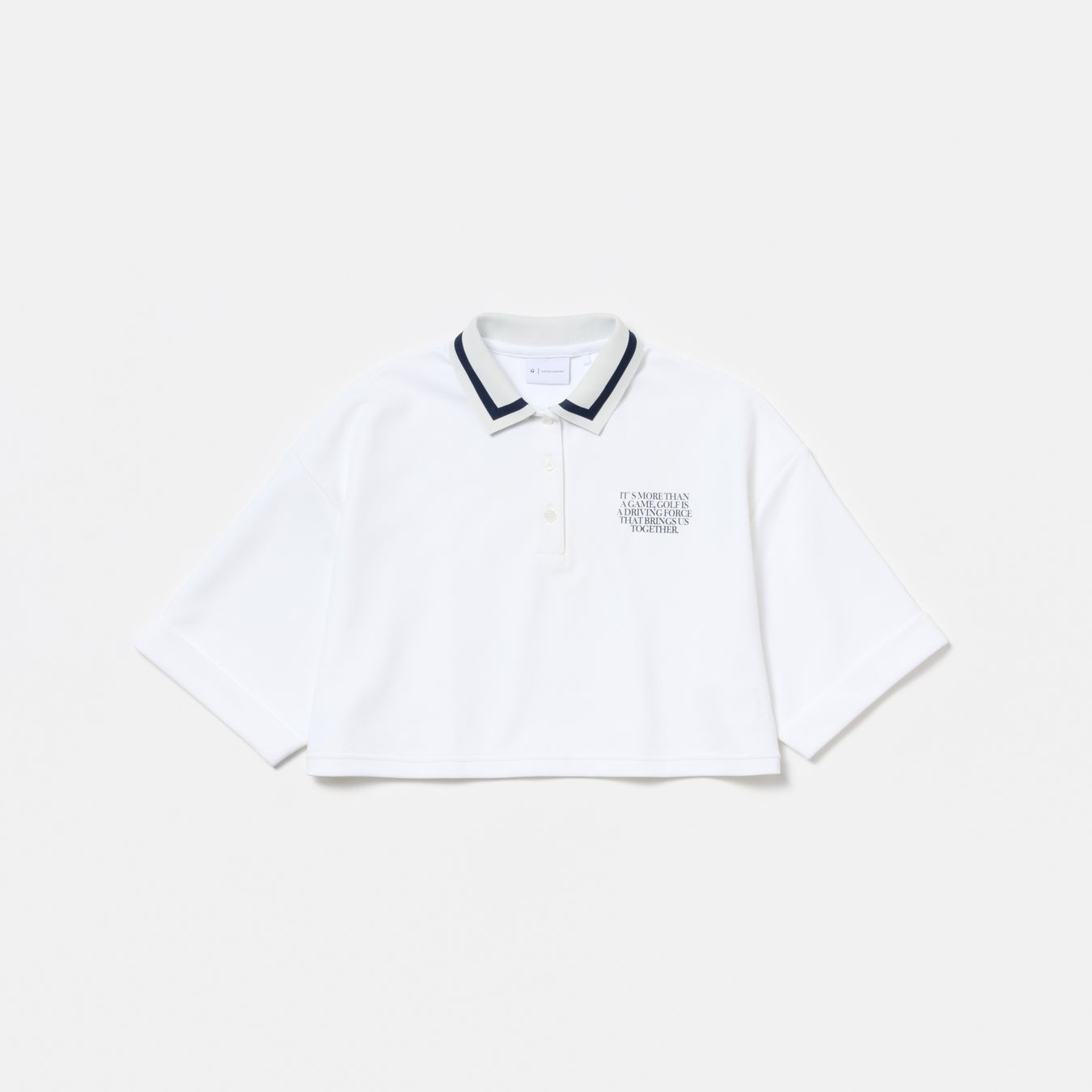 大胆に短く設定した着丈がポイントのポロシャツ。背中には大きくテーラーメイドロゴを、胸元にはメッセージグラフィックを配しています。シンプルながら、襟のラインがスポーティな印象に。