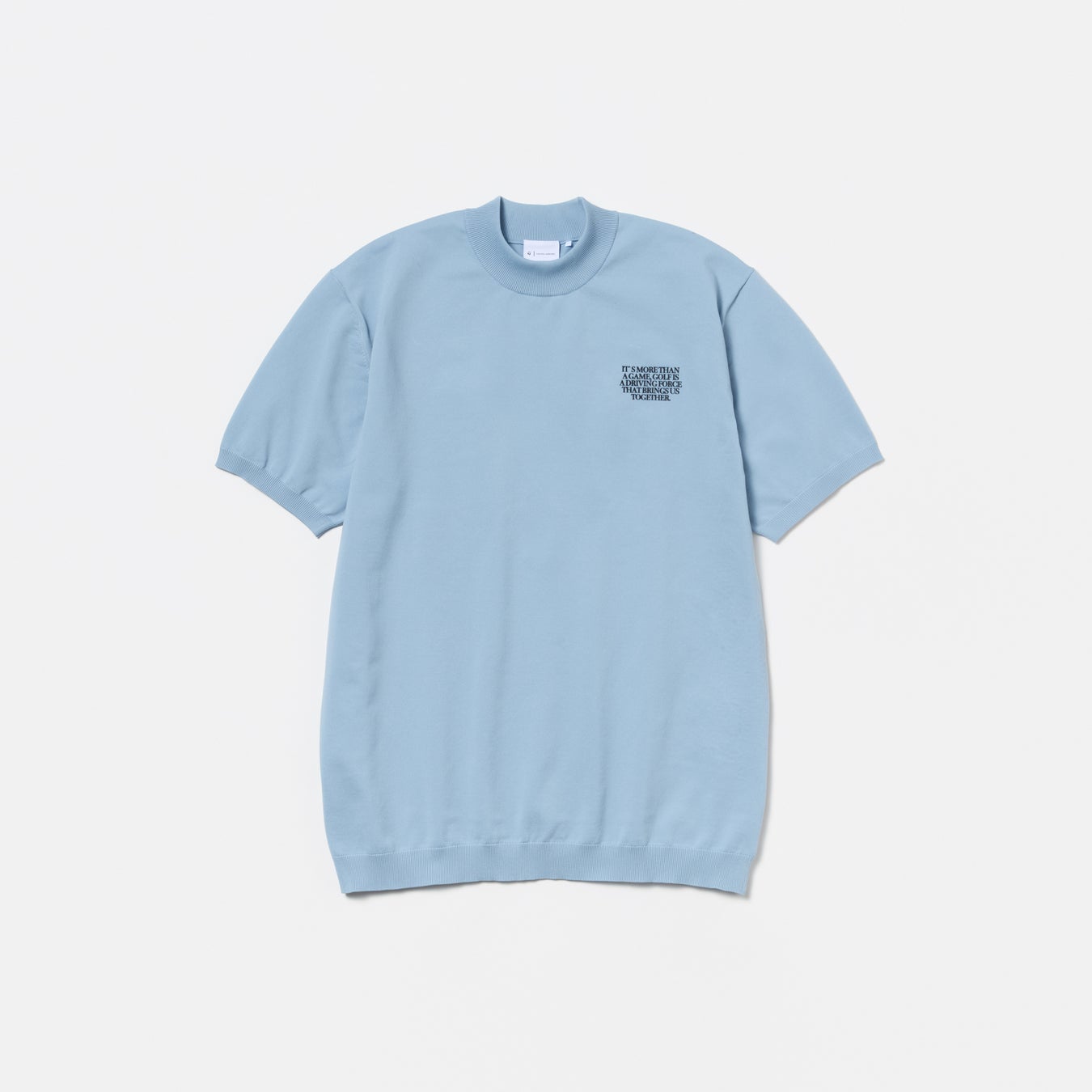 シンプルなショートスリーブデザインのモックネックセーター。左胸にメッセージグラフィック、背中に大きくメタルTロゴを配しています。ユニセックスで着用いただけます。