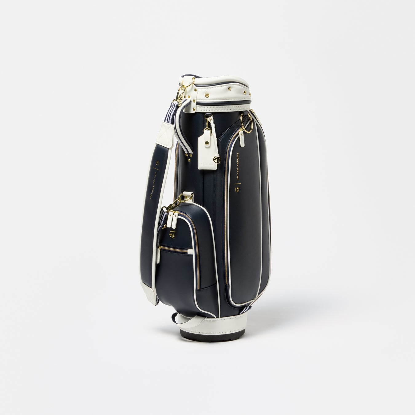 高級感のある合成皮革を採用した、上品でクラシカルな印象のキャディバッグ。シックなネイビーカラーとホワイトの組み合わせのシンプルなデザインに、ゴールドの金具やメタルTロゴを模ったチャーム、箔押しされたコラボレーションロゴ、ストライプ柄が施された内生地やショルダーベルト・ハンドル等がアクセントになったデザインが特徴。背面にはシューズポケットも搭載するなど機能性にも優れたモデルです。