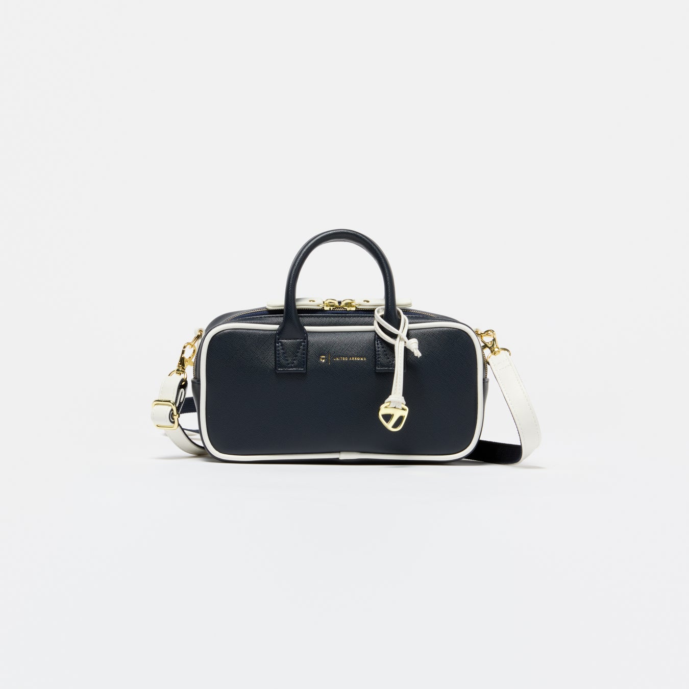 高級感のある合成皮革を採用した、上品でクラシカルな印象のラウンドトート。ネイビーのボディに、ホワイトのパイピングやゴールドで箔押しされたロゴが映えるシックなデザイン。内側にプリントしたストライプ柄がさりげないポイントです。小ぶりながらペットボトルを収納できるサイズ感に、肩掛けできるショルダーベルト付きで、使い勝手の良さも魅力です。