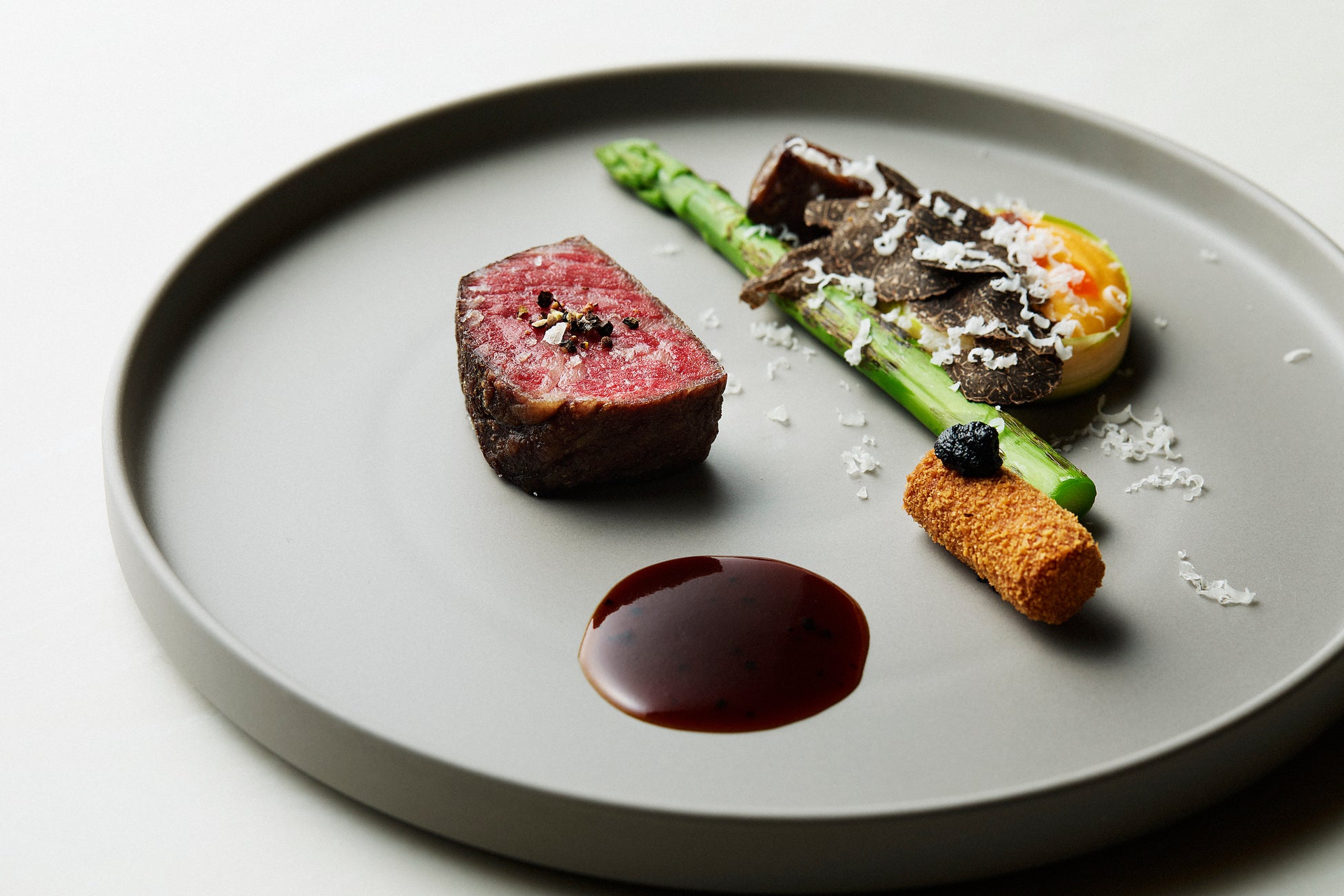 鮮魚のタルタル トマト ブラックオリーブ/自家製スパゲッティ 貝 山菜/鮮魚のソテ ー 春の豆/十勝ハーブ牛の炭火焼き アスパラガス 卵黄のコンフィ/ピエール・エル メ・パリによるデザート
