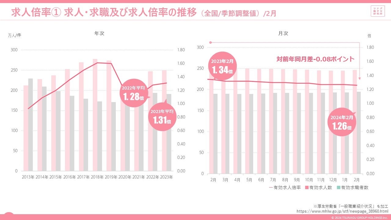 2024年2月度の有効求人倍率は1.26倍。2か月ぶりに前月を下回る。