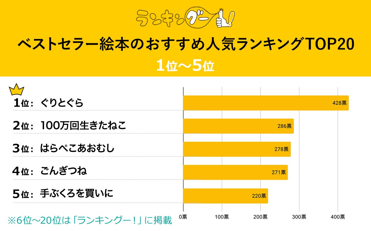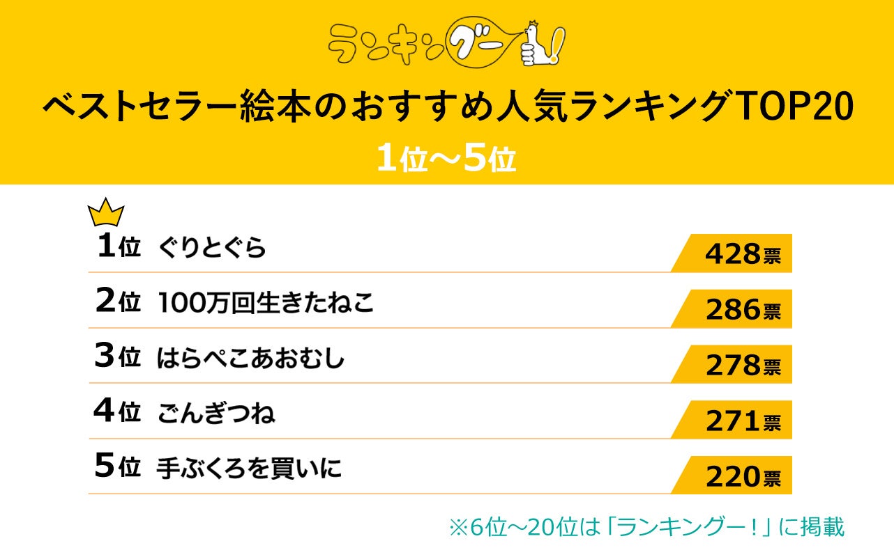 ランキングー!ではベストセラー絵本をピックアップし、ランキングを調査。10~50代の男女(性別回答しないを含む)5,235名にアンケートを行い、TOP20を決定しました。ここではTOP5をご紹介します。