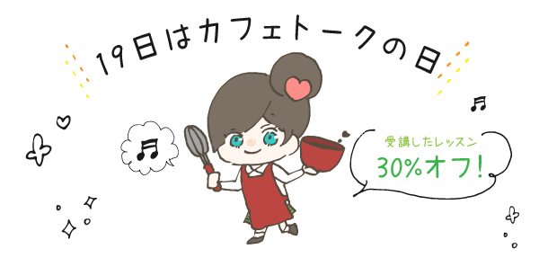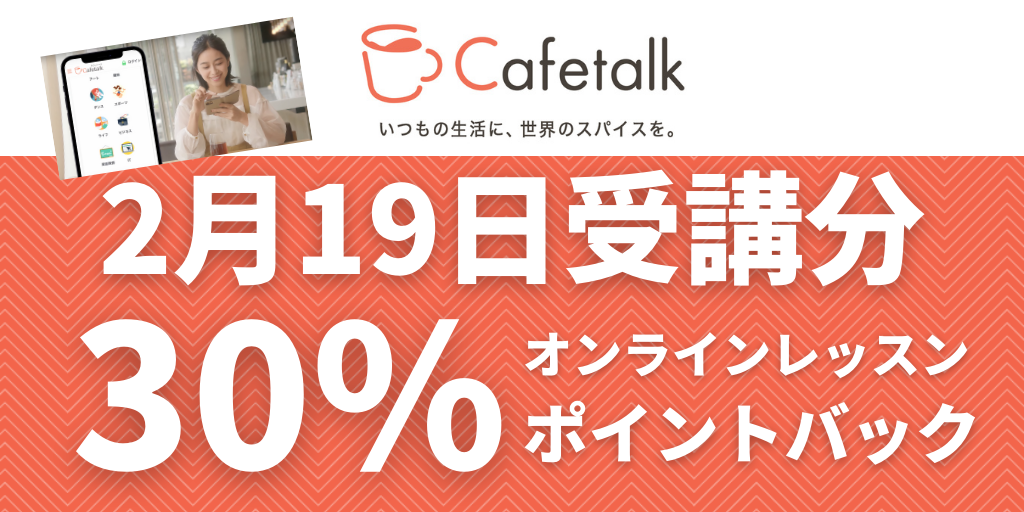 日本最大級オンライン習い事サイト「カフェトーク」が毎月19日と29日に実施している30%ポイントバックキャンペーンです。*2月は19日と28日に実施予定