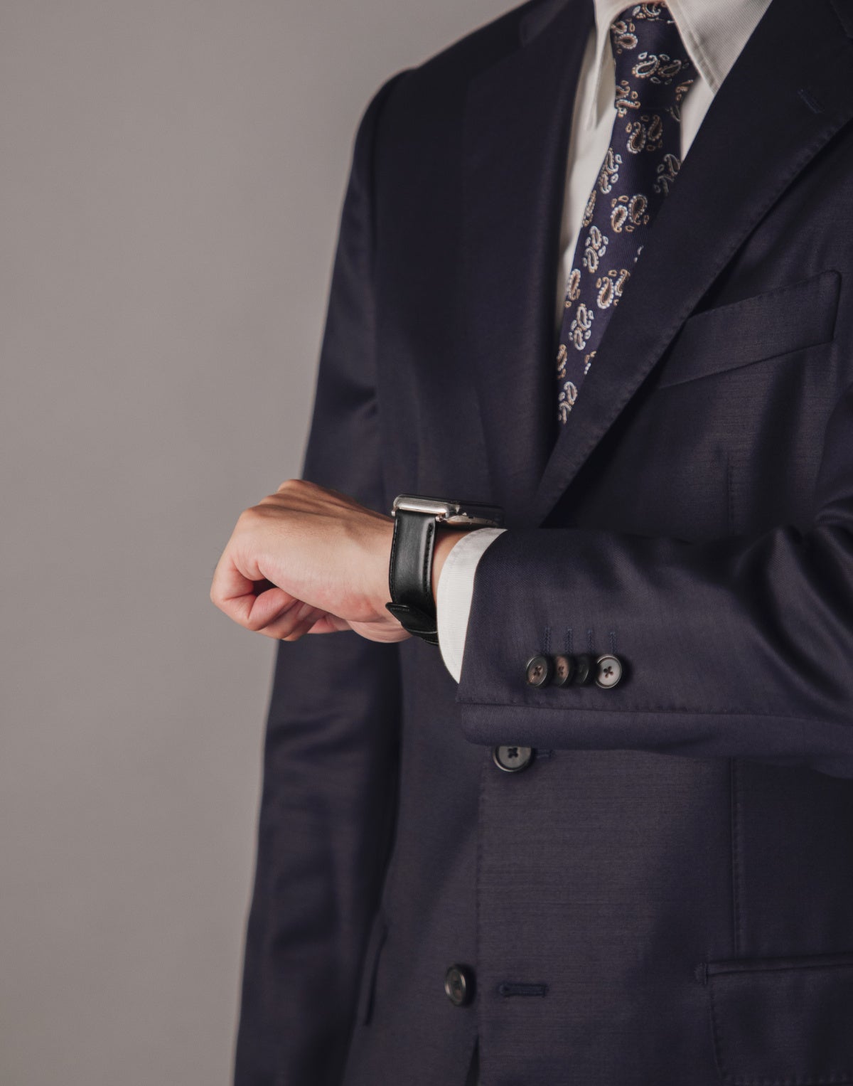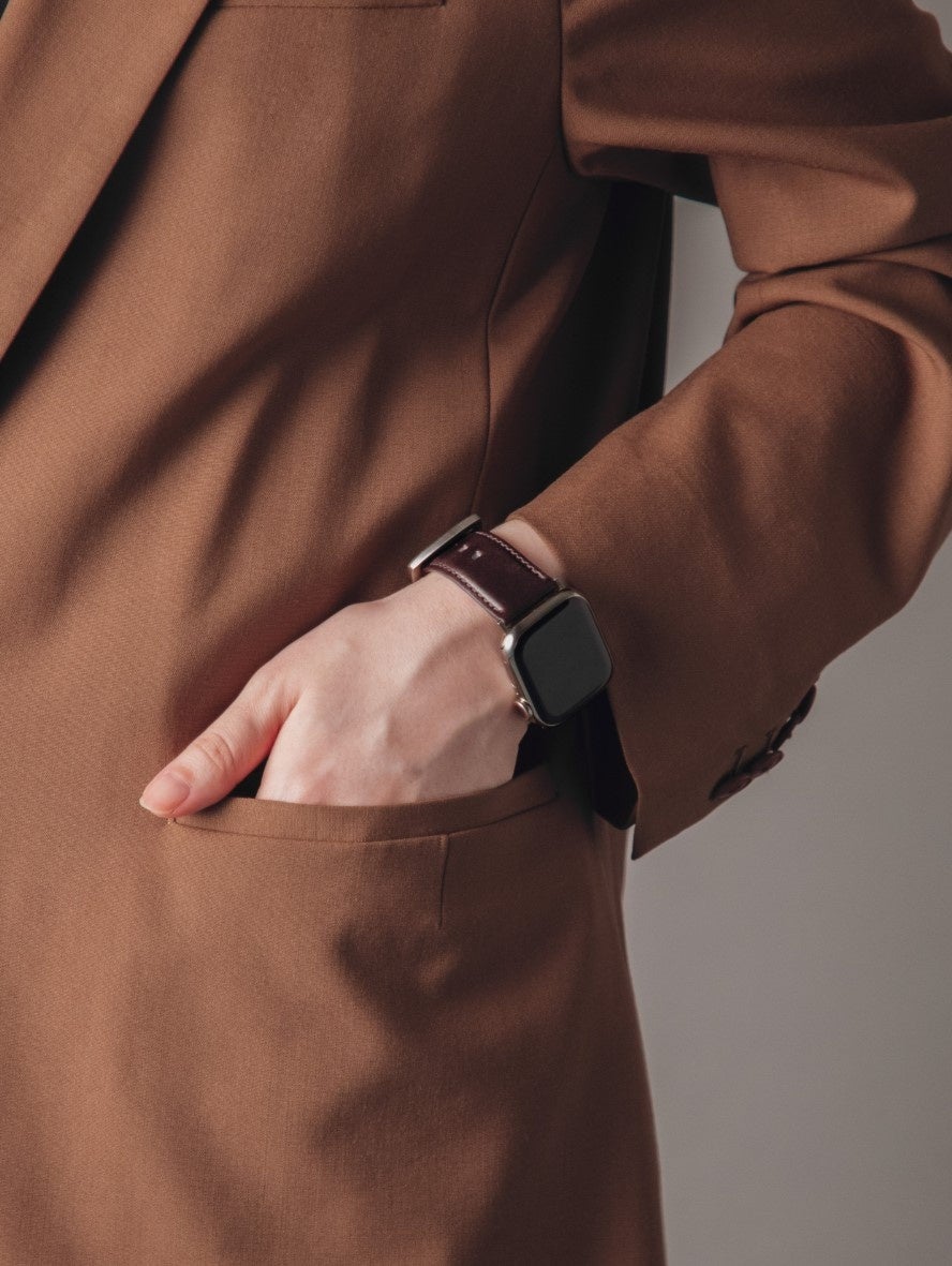 Apple Watch42・44・45mm用と38・40・41mm用の2タイプを展開。長さは男女問わずお使いいただけるよう、9段階で調整可能です。挿し込みながらスライドさせるだけで、簡単に装着・脱着できるようになっています。