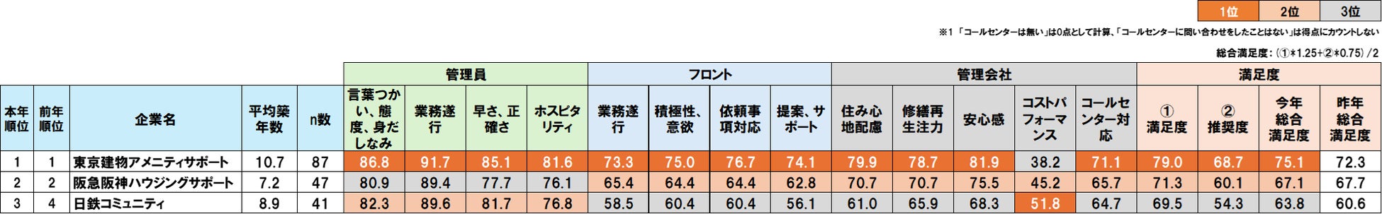 「管理人」「フロント」「管理会社」など主要項目において、コストパフォーマンスを除くすべてで1位を達成した。規模を超えたサービス品質が評価され、居住者から非常に高い支持を得ている。